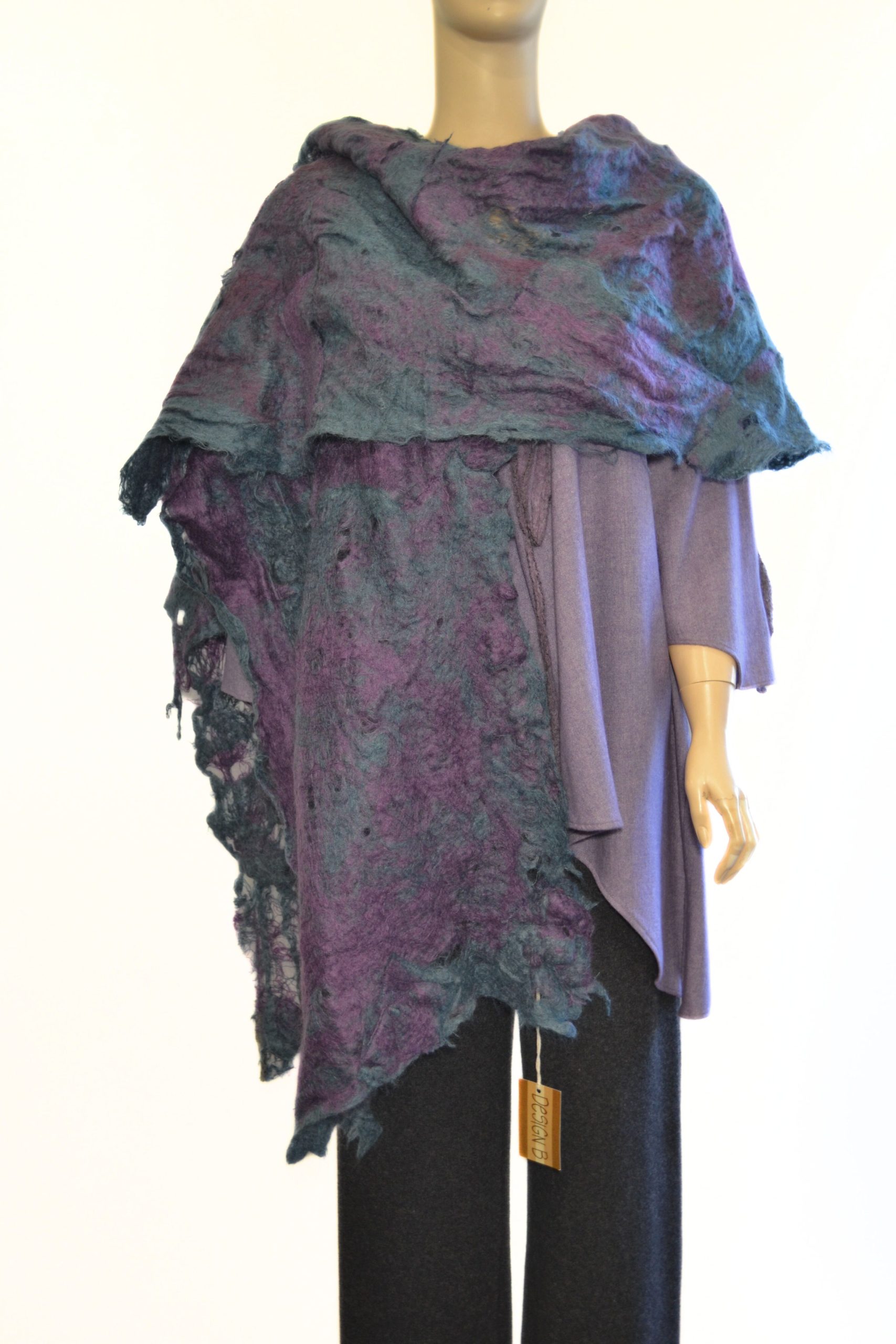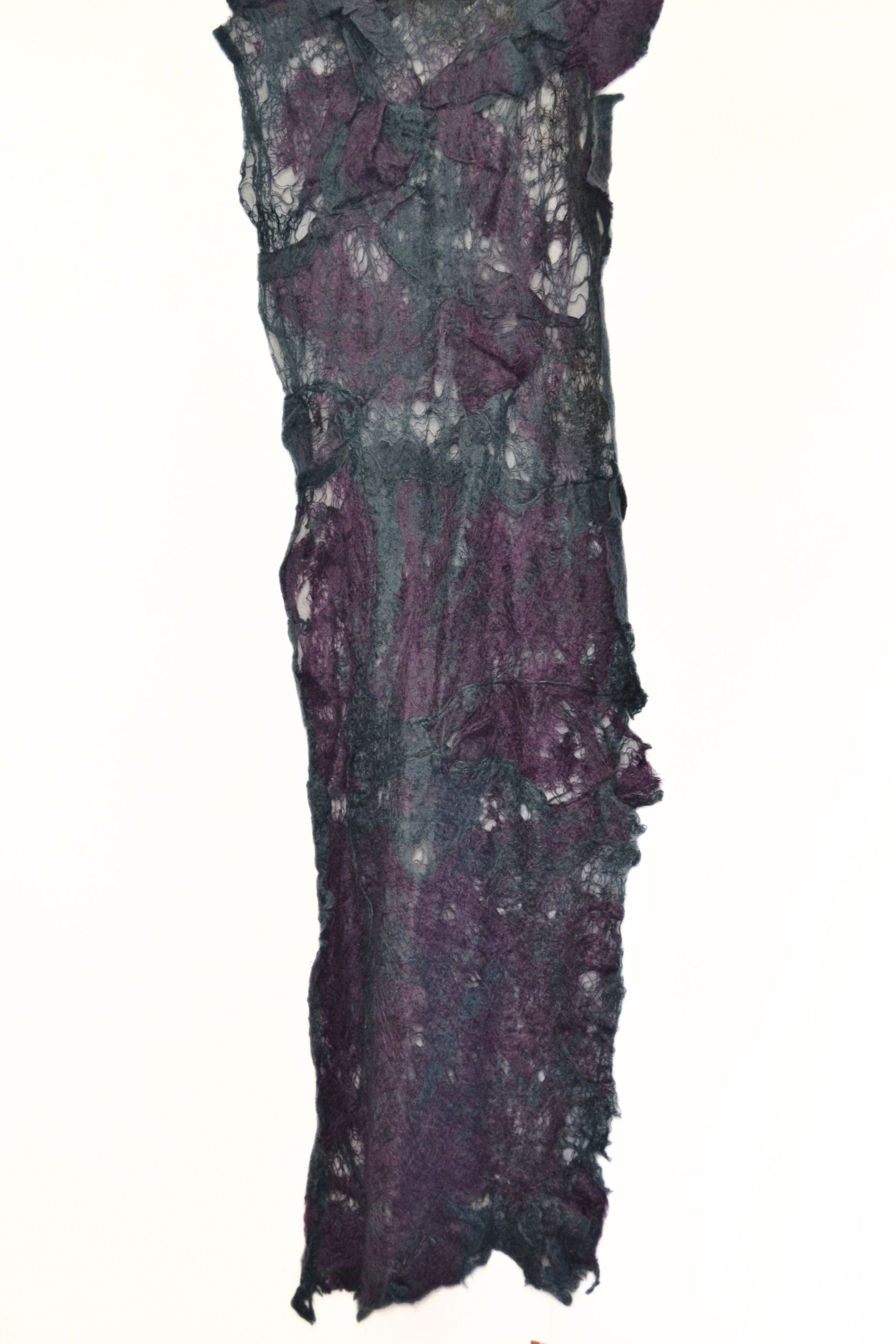 Unikatowy, długi szal to wyjątkowe połączenie naturalnej wełny filcowanej i artystycznej formy. Utrzymany jest w subtelnych, przenikających się odcieniach fioletu i koloru morskiego.