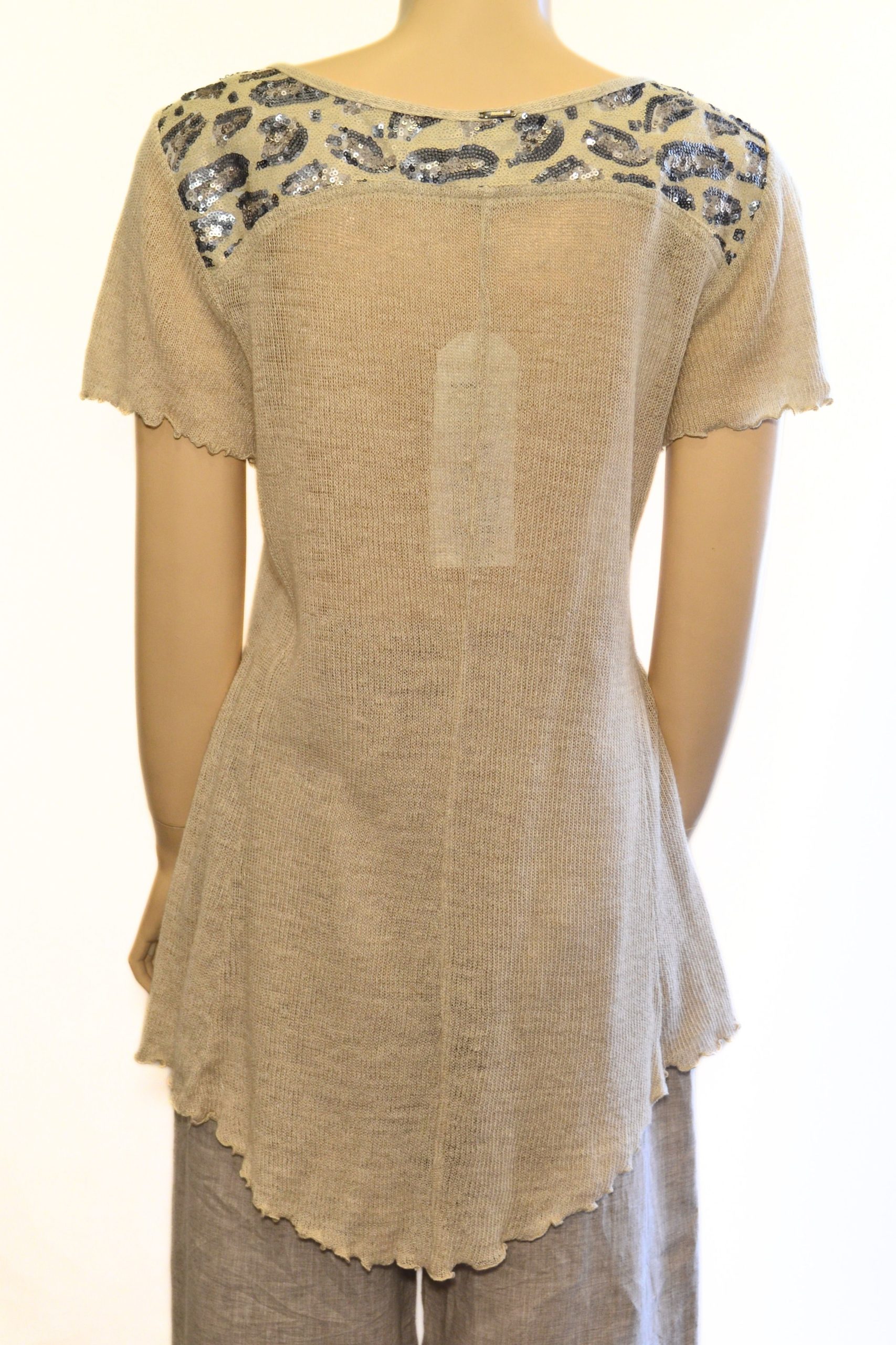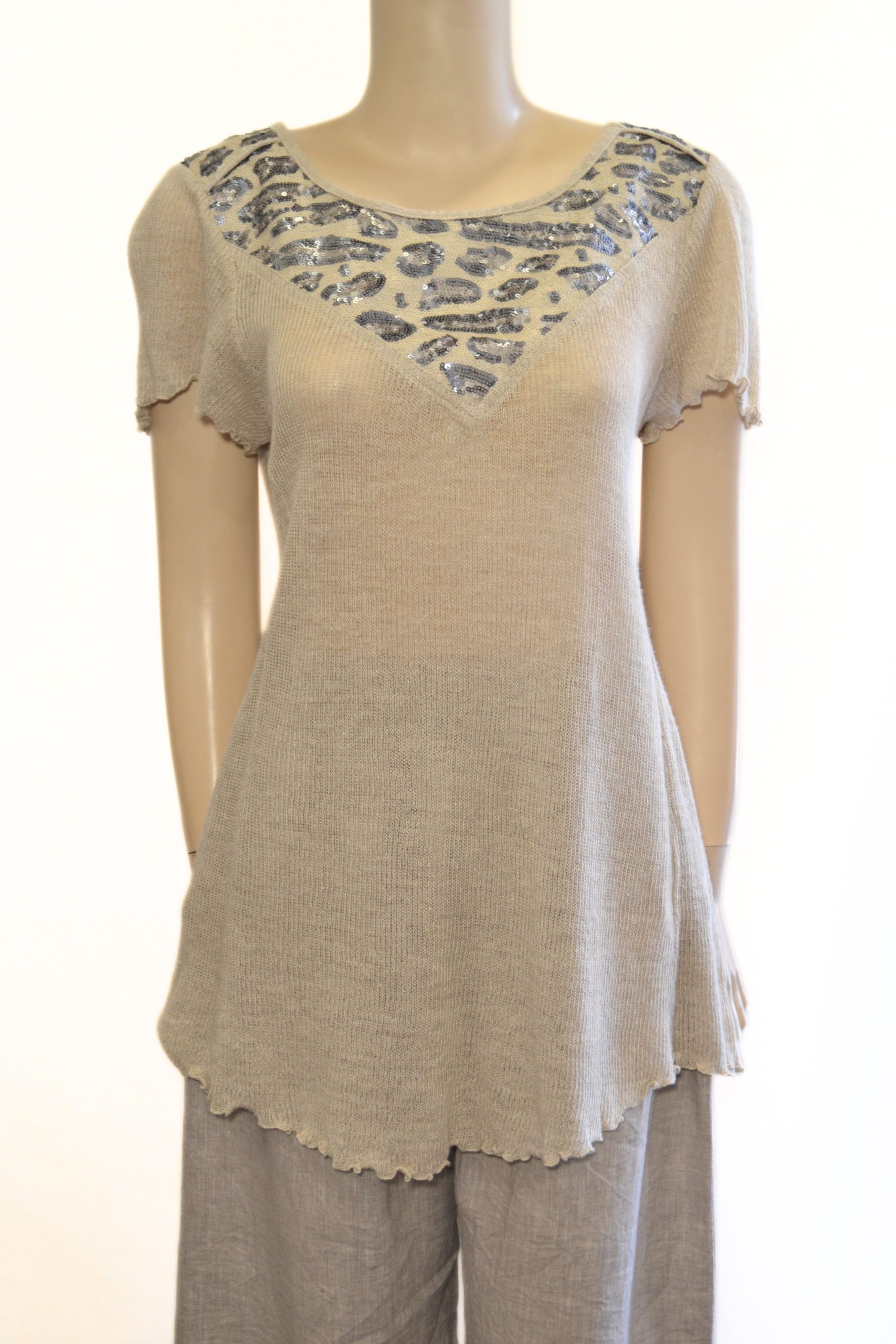 Nasza bluzka z przędzy lnianej zachwyca subtelnym trójkątnym cięciem przodu i tyłu oraz krótkim rękawem. Elegancka ozdobna wstawka dodaje stylu, a przewiewny len sprawia, że nosi się ją wyjątkowo komfortowo – idealna na lato i codzienne, lekkie stylizacje.