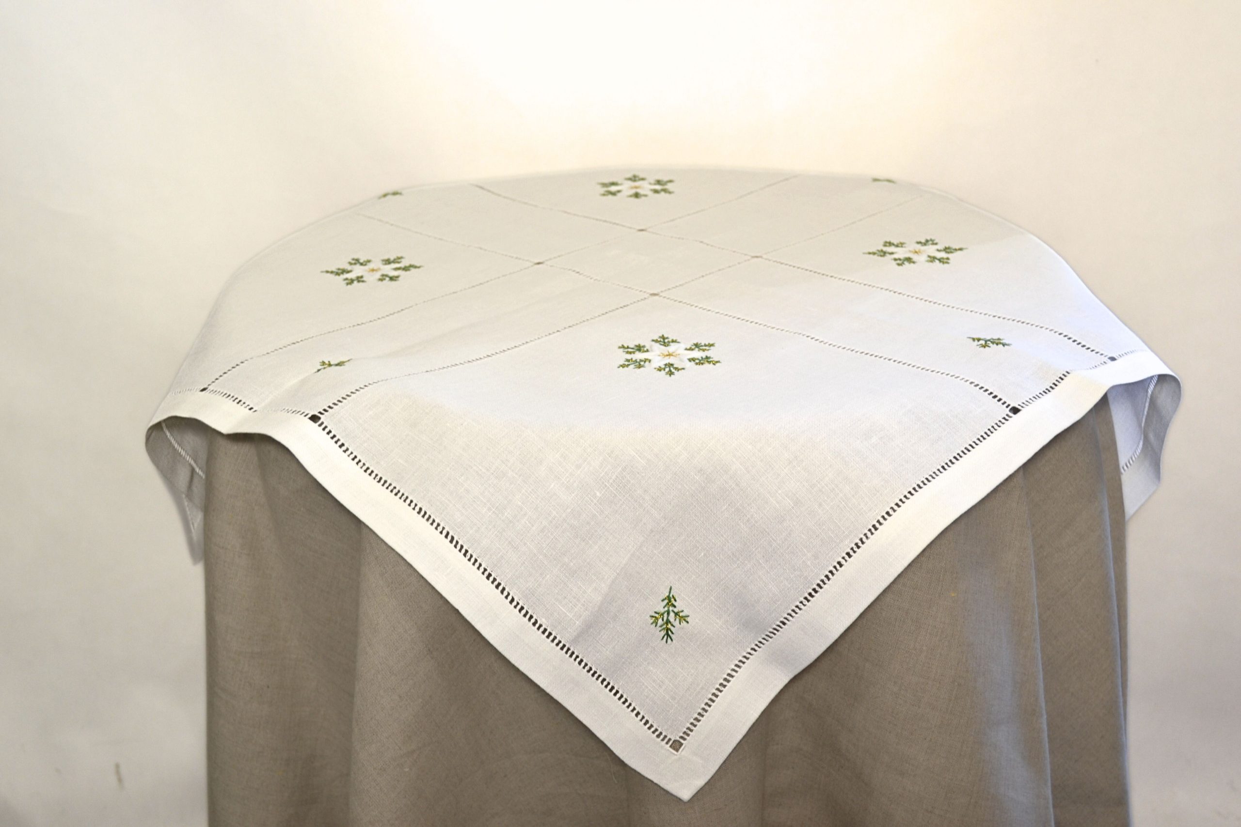 Nadaj swojemu wnętrzu świąteczny blask! Nakładka 75×75 cm z haftem w postaci zielonych gałązek, subtelnych gwiazdek i mereżki to idealny dodatek do bożonarodzeniowego stołu. Elegancka, trwała i łatwa w pielęgnacji – będzie cieszyć oko przez wiele sezonów.