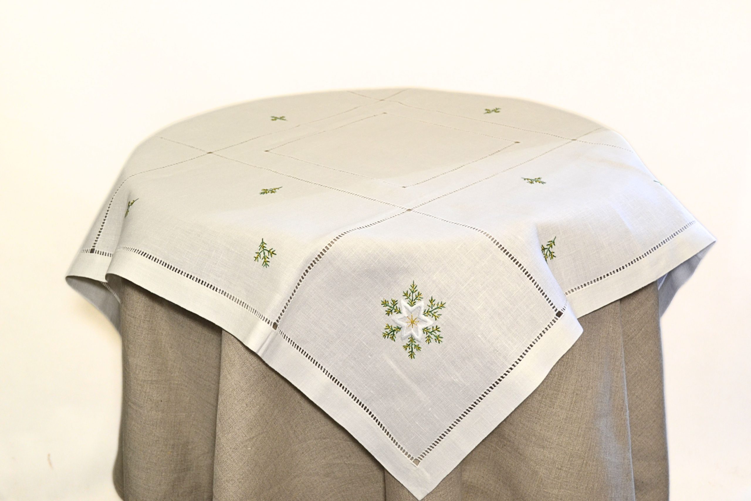 Nadaj swojemu wnętrzu świąteczny blask! Nakładka 80×80 cm z haftem w postaci zielonych gałązek, subtelnych gwiazdek i mereżki to idealny dodatek do bożonarodzeniowego stołu. Elegancka, trwała i łatwa w pielęgnacji – będzie cieszyć oko przez wiele sezonów.
