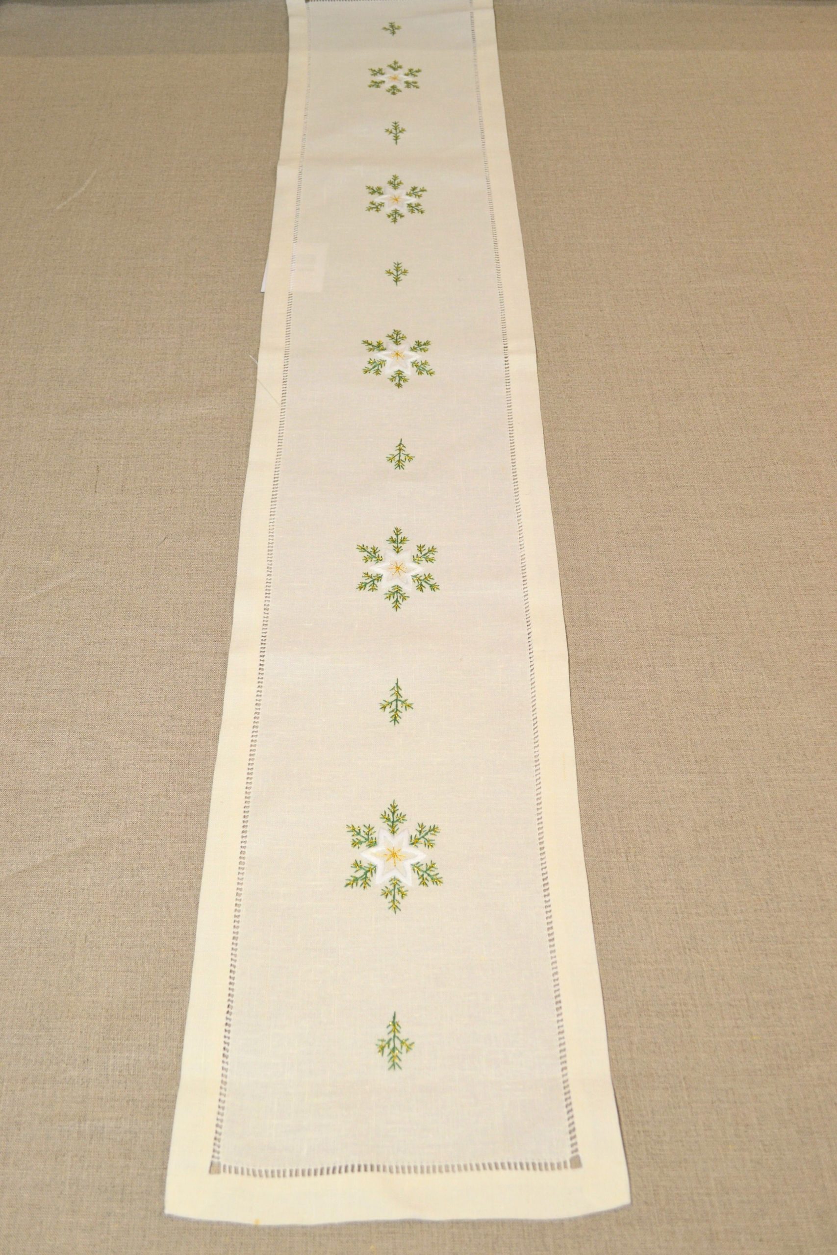 Bieżnik ecru 22×130 cm z ręcznie haftowaną mereżką i gwiazdkami
