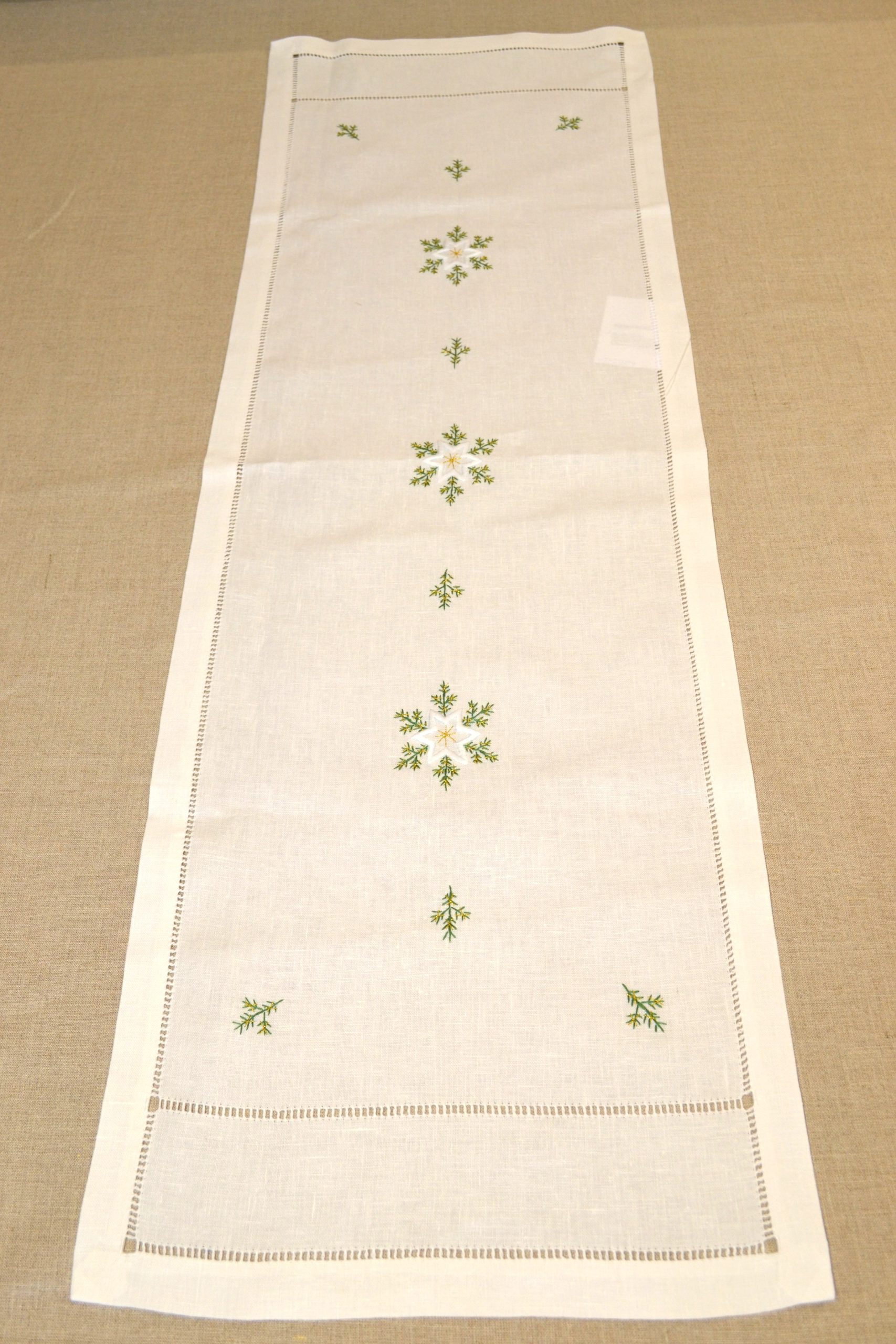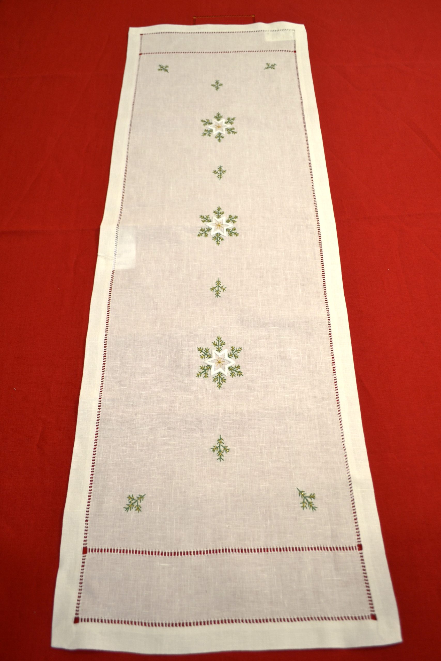 Bieżnik biały 35×110 cm z ręcznie haftowaną mereżką i gwiazdkami