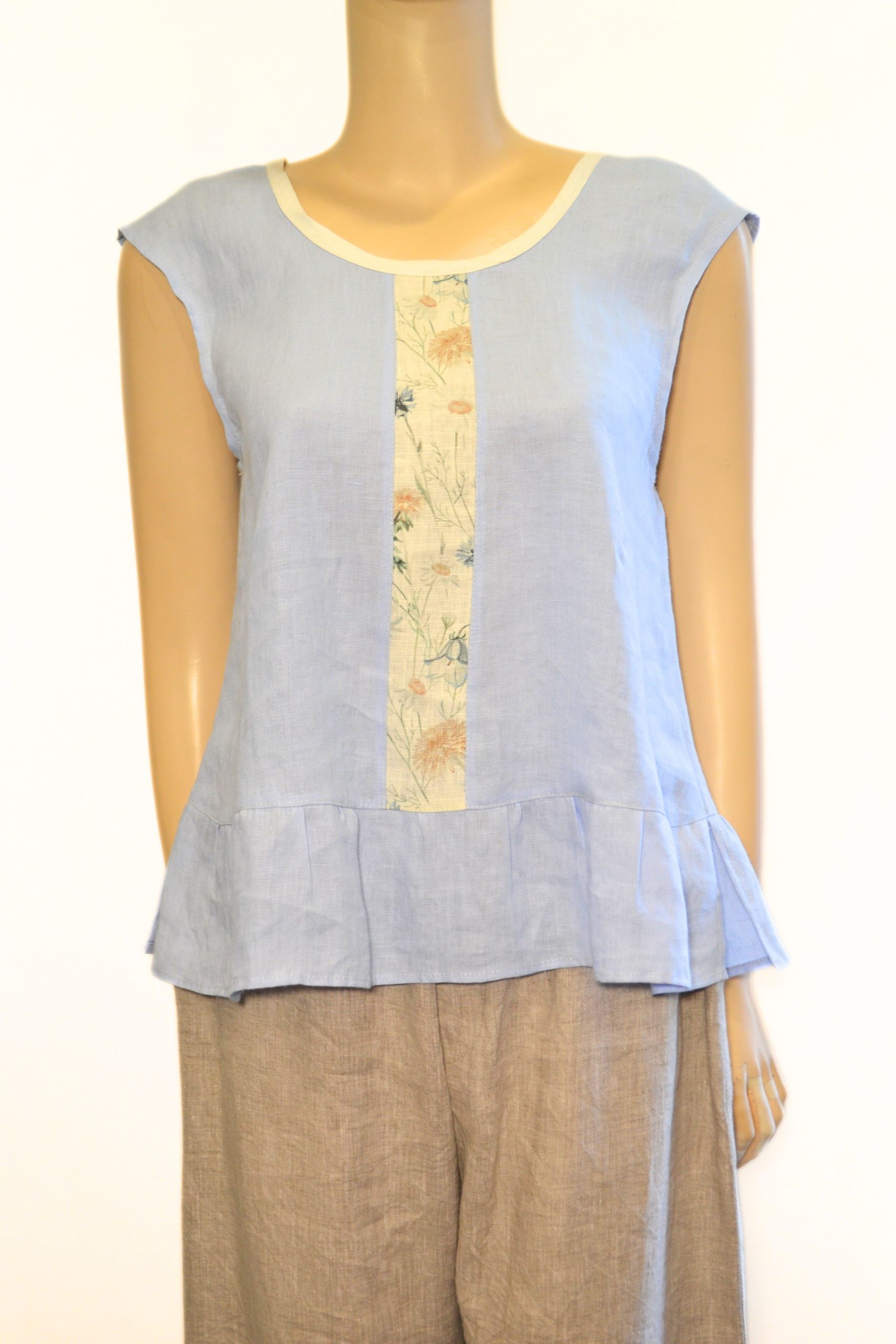 Lekki, przewiewny lniany top w delikatnym odcieniu niebieskiego z kwiatową wstawką z przodu. Dół wykończony subtelną falbanką, dodającą uroku i lekkości.