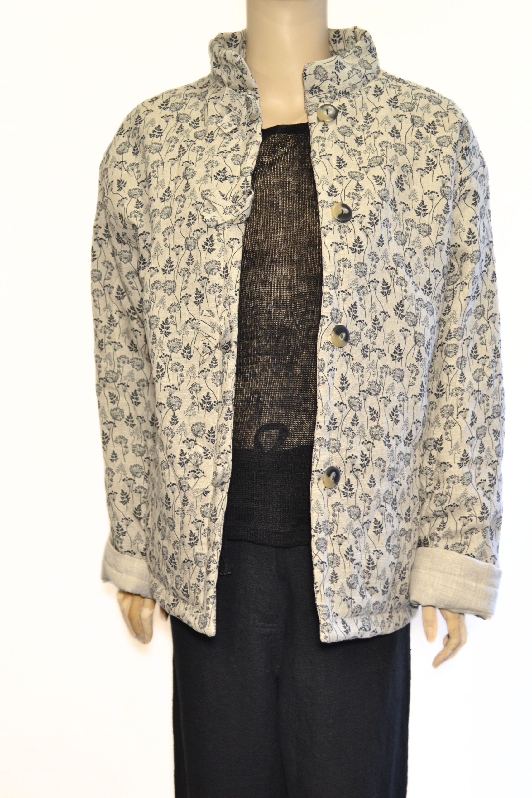 Ta wyjątkowa kurtka łączy naturalny urok lnu z ciepłem i wygodą, tworząc idealny wybór na chłodniejsze dni. Obwód klatki piersiowej do 114 cm, długość 68cm. Wykonana w 100% z lnu z kwiatowym roślin.