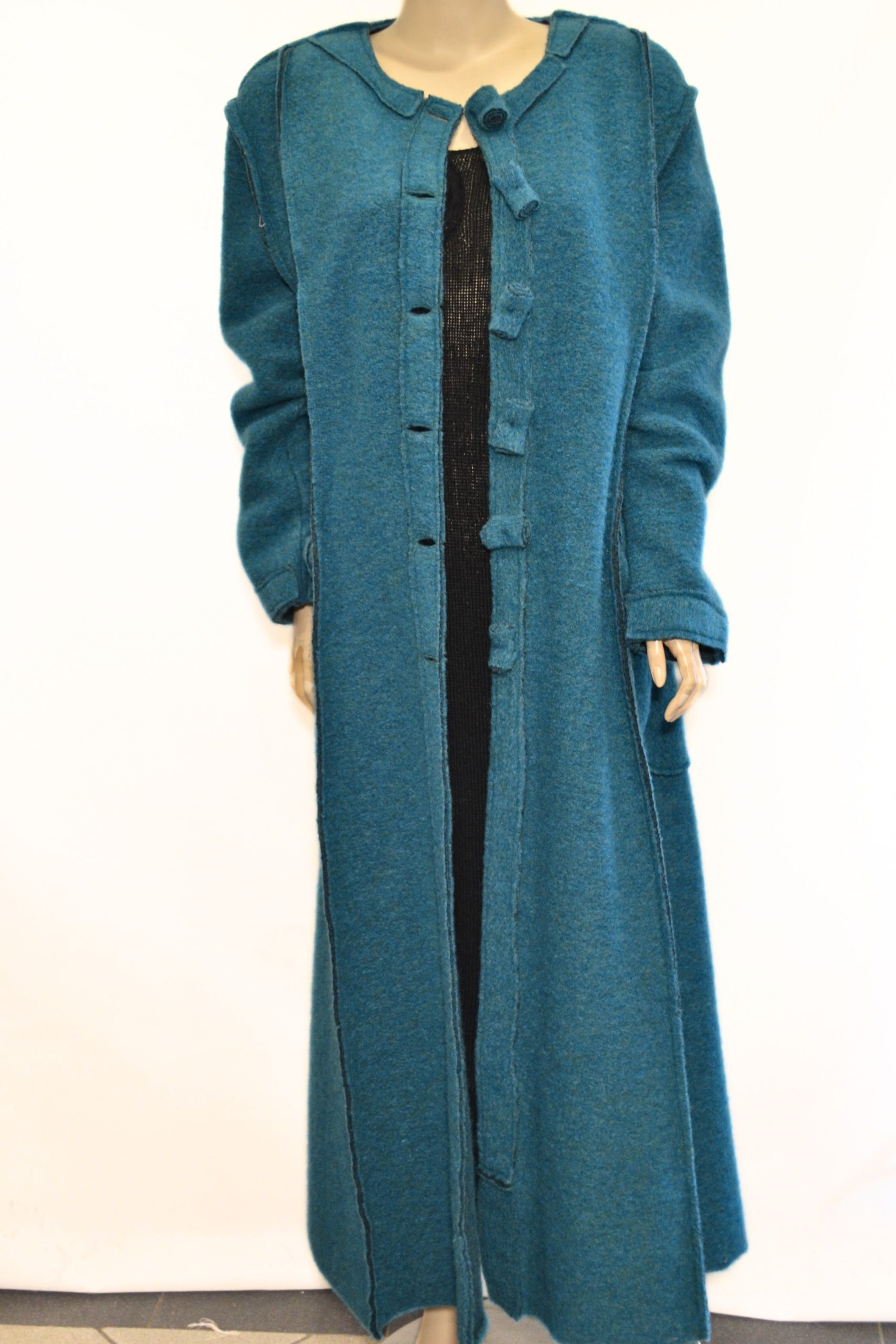 Wyjątkowy, ręcznie wykonany płaszcz damski z filcowanej wełny w głębokim, turkusowo-zielonym odcieniu. To nie tylko element garderoby, ale również unikatowe dzieło sztuki użytkowej, stworzone z pasją i precyzją przez artystkę.