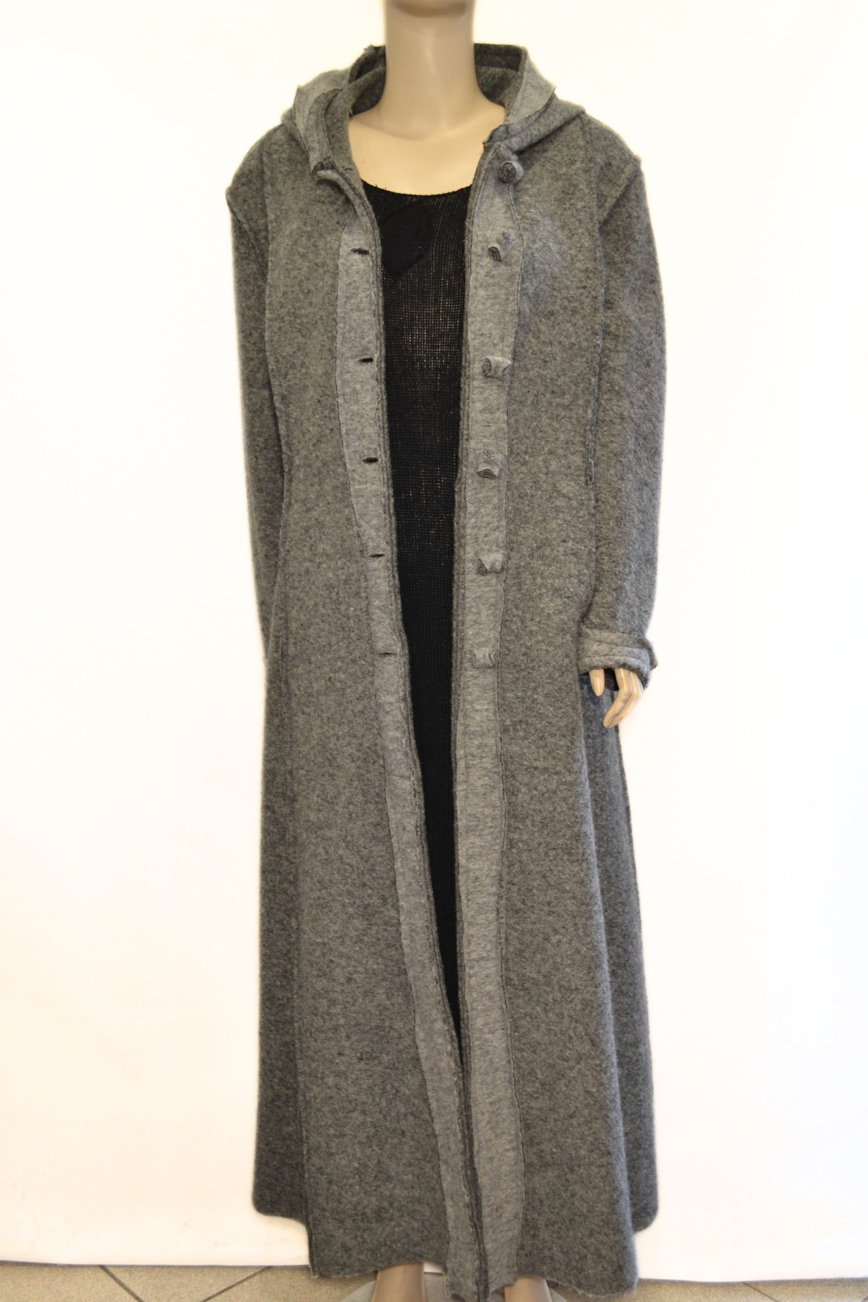 Wyjątkowy, ręcznie wykonany płaszcz damski z filcowanej wełny w ponadczasowym odcieniu popielu. To nie tylko element garderoby, ale prawdziwe dzieło sztuki użytkowej, stworzone z dbałością o detal przez artystkę.