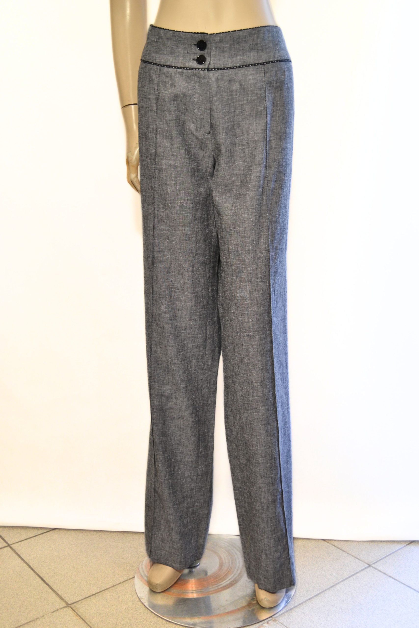 Eleganckie i lekkie spodnie lniane w melanżowym odcieniu, idealne na ciepłe dni. Model z prostymi nogawkami, bez kieszeni, zapewnia minimalistyczny i nowoczesny look. Zapinane na dwa guziki oraz zamek błyskawiczny, łączą wygodę z klasycznym stylem. Doskonałe do casualowych i bardziej formalnych stylizacji.