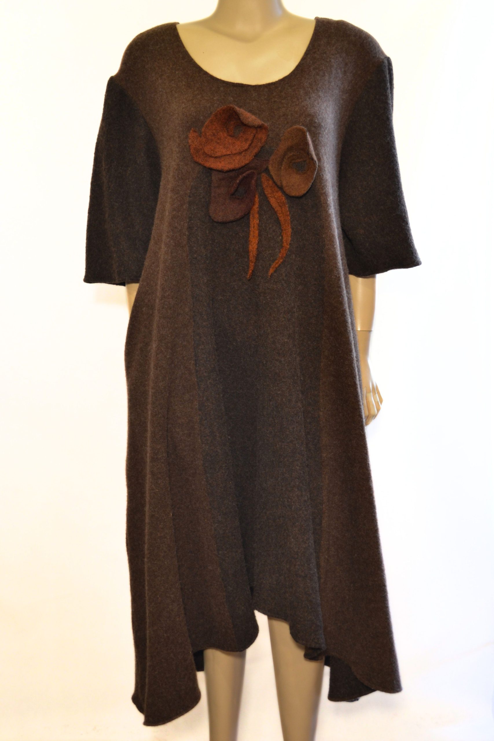Krótka sukienka wykonana z miękkiej, filcowanej wełny w odcieniach głębokiego brązu. Szyta ze skosu, dzięki czemu pięknie układa się na sylwetce i zyskuje lekkość w ruchu. Ręcznie naszywane aplikacje nadają jej artystycznego charakteru, a praktyczne kieszenie zapewniają wygodę na co dzień. To unikatowy model, który łączy prostotę formy z wyrazistą kolorystyką i niepowtarzalnym wykończeniem.