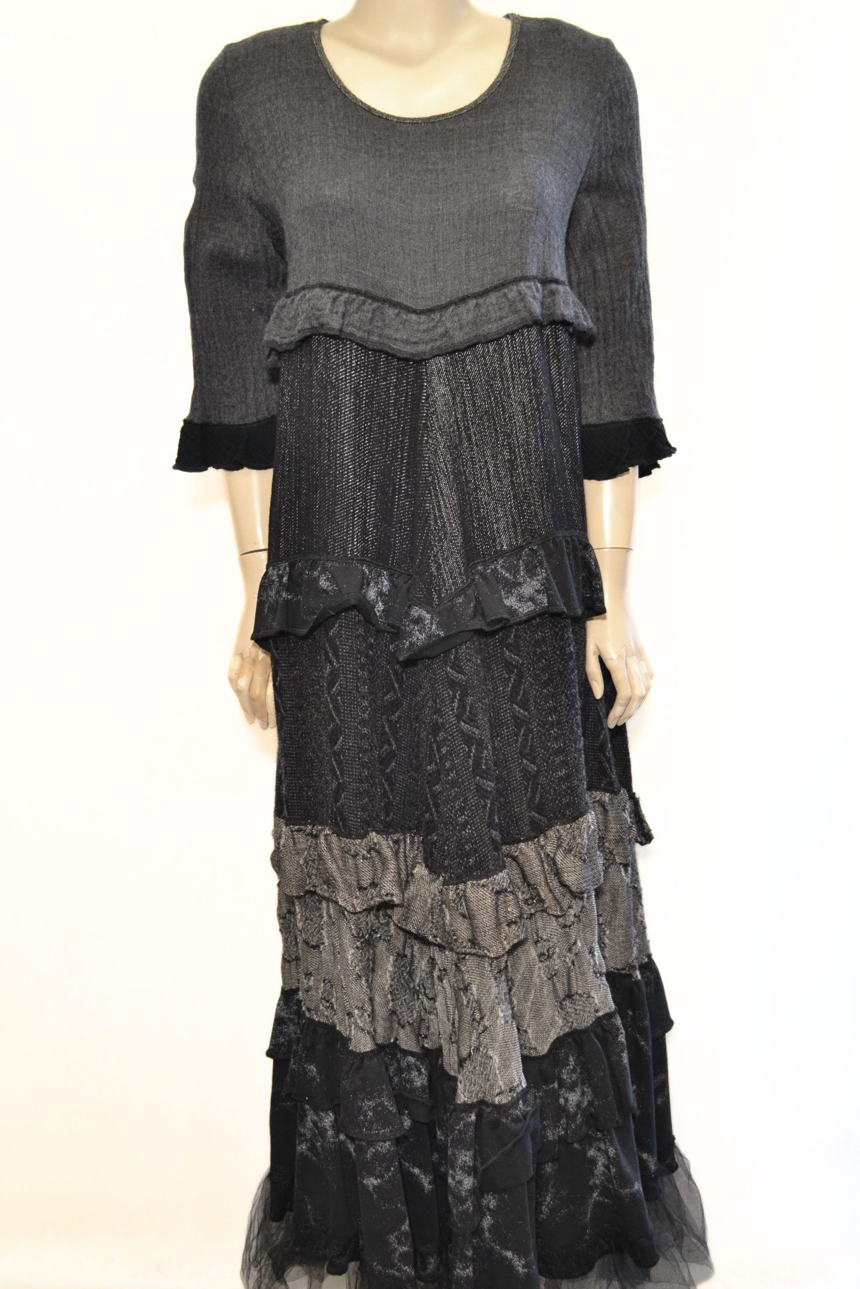 Unikatowa, artystyczna sukienka wykonana z wysokiej jakości wełny, zdobiona ręcznie naszywanymi falbanami, które nadają jej rzeźbiarskiego charakteru i subtelnego ruchu. Utrzymana w eleganckiej tonacji popielato-czarnej, stanowi wyjątkowe połączenie klasyki z awangardą.